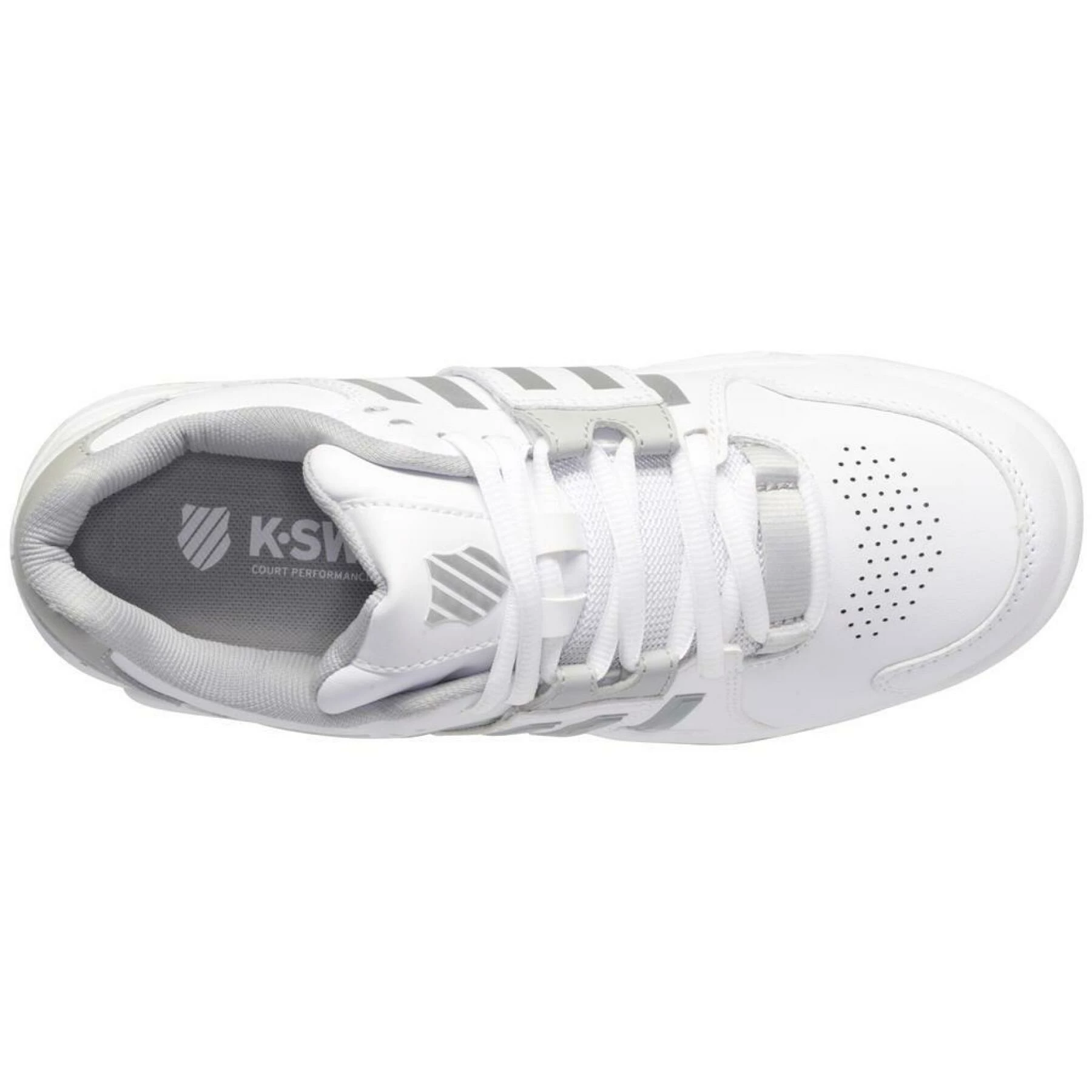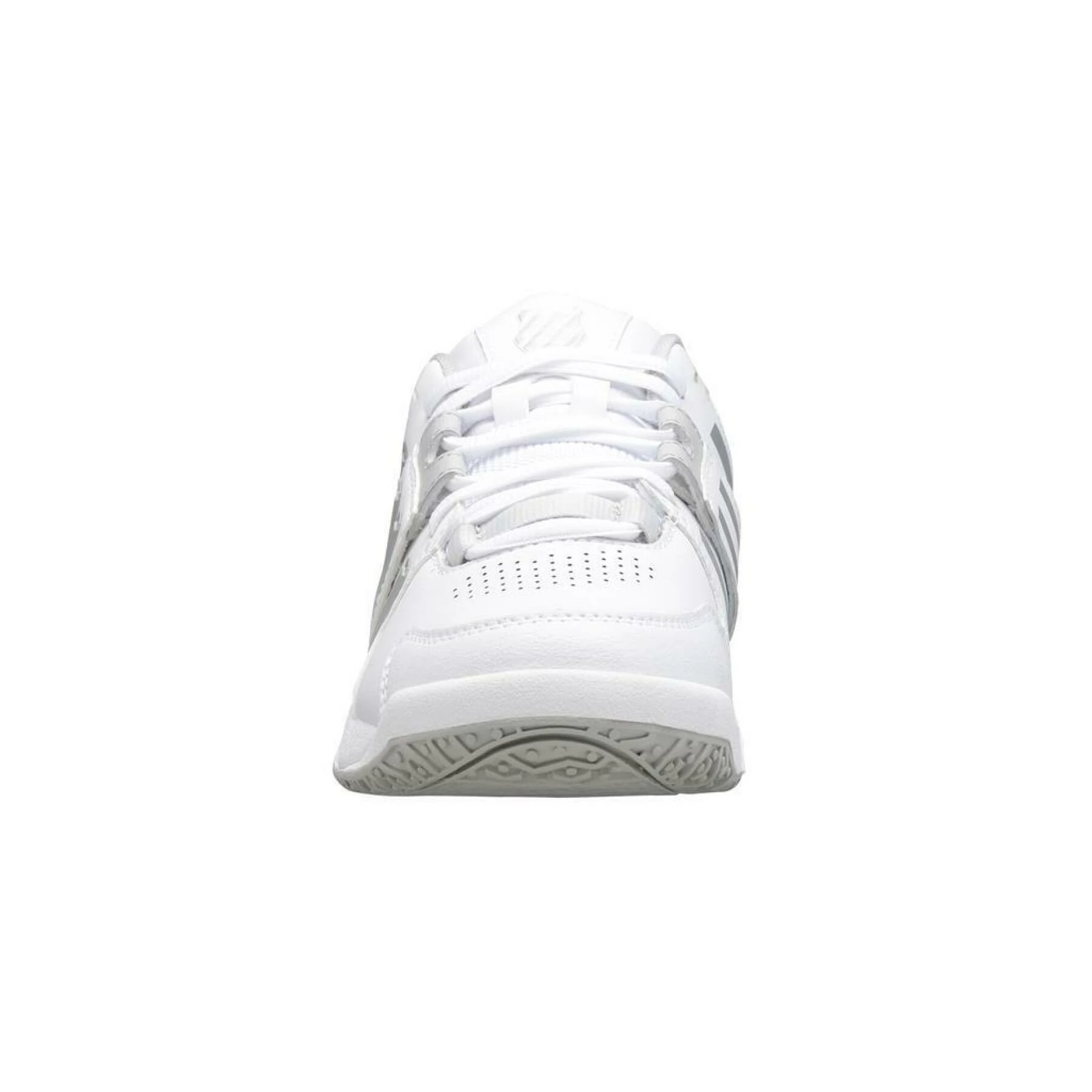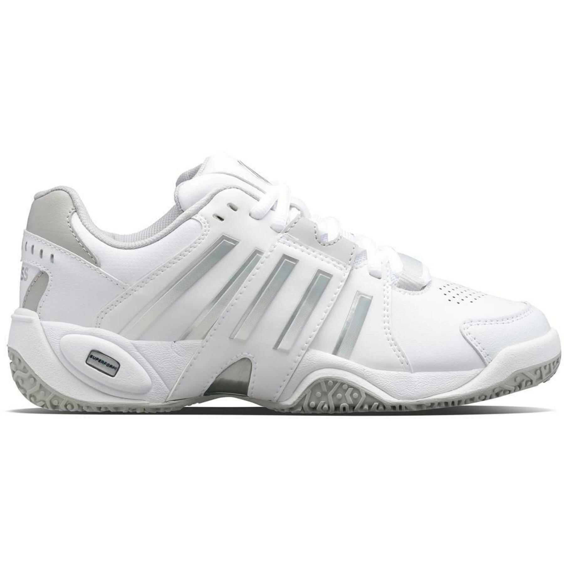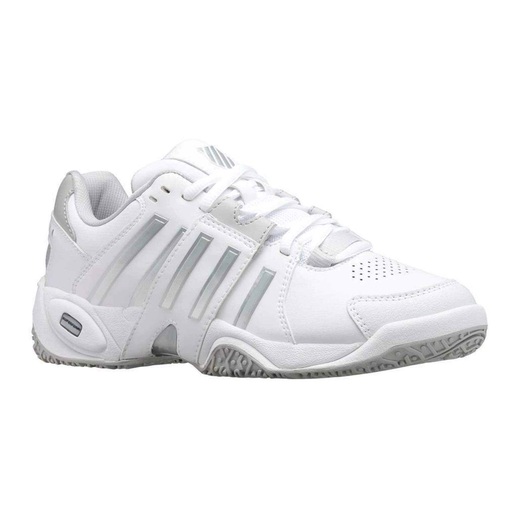 Chaussures de tennis femme K-Swiss Accomplish IV OmniLes chaussures de tennis K-Swiss Accomplish IV Omni pour femmes blanches/grises ont une tige en cuir combiné avec du mesh. Le modèle K-Swiss est doté d’un laçage et de trous perforés pour la ventilation. La chaussure de tennis K-Swiss a une semelle omnicourt non marquante résistante à l’usure et a donc une adhérence suffisante sur les terrains durs, smash court, gazon artificiel et terre battue. La semelle intérieure est amovible